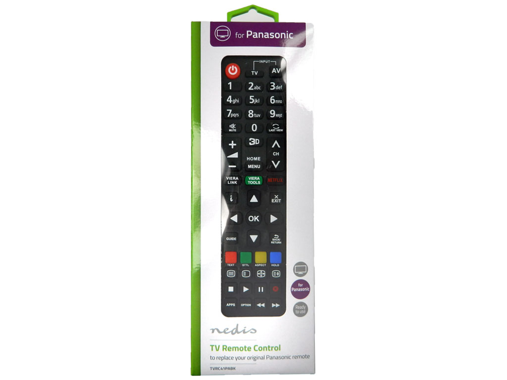 Nahraďte ztracený nebo poškozený Panasonic dálkový ovladač tímto předprogramovaným Nedis® náhradním dálkovým TV ovladačem, který je kompatibilní se všemi televizory Panasonic. Díky rozsáhlé vestavěné databázi kódů nabízí veškeré funkce původní verze. Nedis® náhradní ovladač se snadno používá a nevyžaduje žádné programování. Stačí vložit baterie a můžete začít.