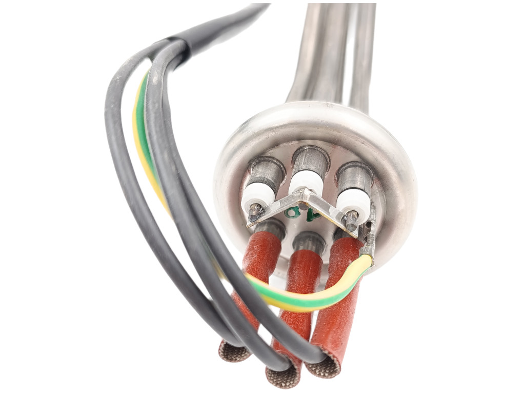 Topné těleso má robustní konstrukci se třemi topnými spirálami a montážní kulatou přírubou Ø 47,5 mm, která umožňuje přesnou instalaci do nádrže myčky. Konstrukce je navržena pro dlouhodobý provoz v náročných podmínkách profesionálních kuchyní.