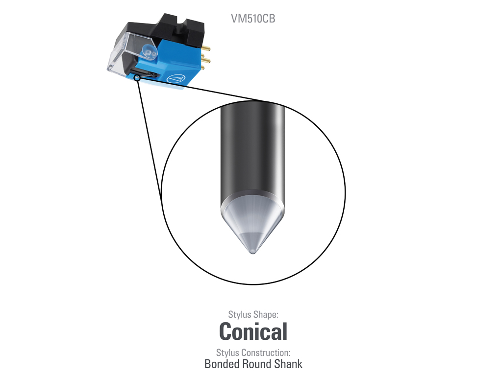 Základní model přenosky AudioTechnica s tělem řady 500, kónickým hrotem 0.6 mil a dvojitými magnety, jejichž umístění dokonale odpovídá oběma stopám stereo nahrávky a zlepšuje tak oddělení kanálů. Kónický hrot sleduje střed stopy a vyniká vysokou spolehlivostí i výjimečnou věrností.