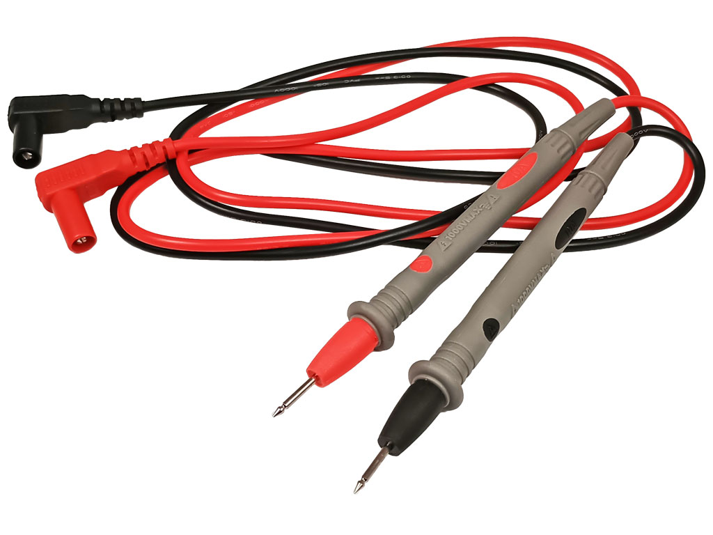 Úhlový plně krytý banánek, měřící hrot 145mm, maximální zatížení 1A, celková délka 110cm.