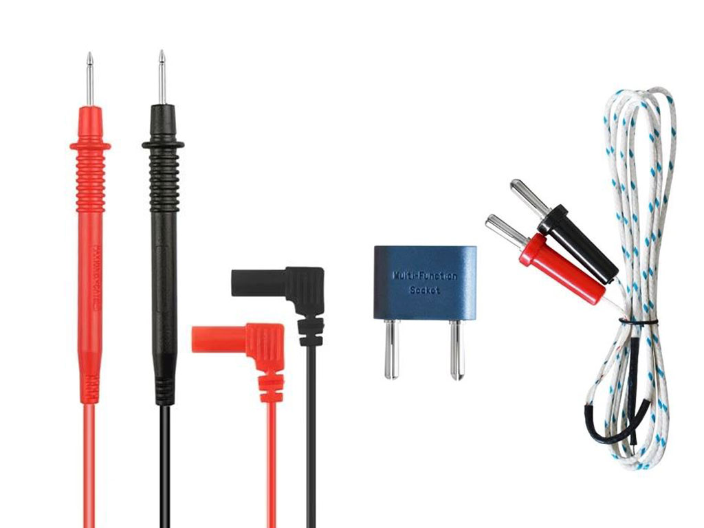 Obsah balení: Multimetr (s baterií), gumové pouzdro, multifunkční zásuvka, testovací kabel, návod