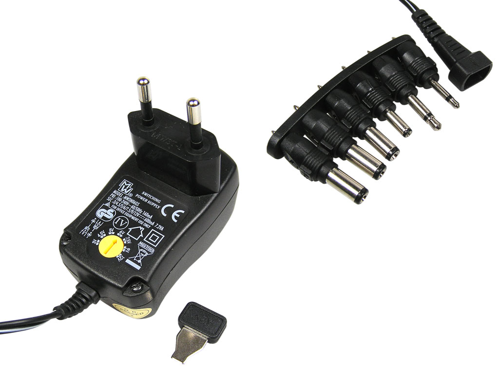 6xkonektorů, možnost změny polarity, nastavení výstupního napětí v rozmezí 3 - 4.5 - 6 - 7.5 - 9 - 12V / 600mA. Ochrana proti zkratu, indikace provozu červenou LED diodou. Kompaktní velikost, nízká váha. CE. Eco-Friendly